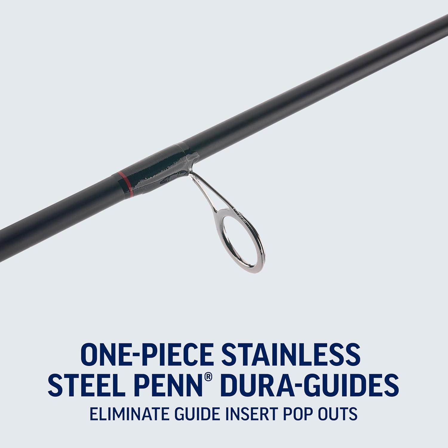 The PENN Fierce III spinning combos feature power and performance for any inshore, boat, orsurffishing situation. The rod features a graphite composite blank, one-piece stainless steel Dura-Guides, and finger grooves in the EVA grips which provide extra traction when fighting fish. The reel features a full metal body and sideplate, along with PENN's HT-100 carbon fiber drag washers, the Fierce III combo can handle any inshore or nearshore situation.
